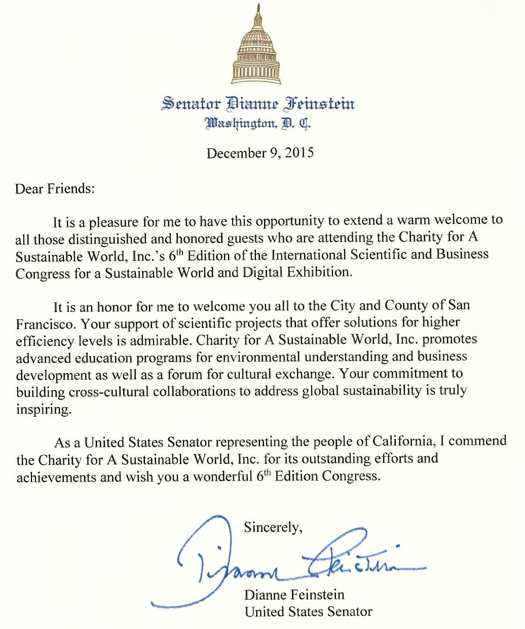 The International Scientific and Business Congress for a Sustainable World, together with its Digital Exhibition on pioneering sustainable innovations across all areas of the economy and public life, and with its overarching goal of Increasing the Well‑Being of All Mankind, was scheduled for December 9, 2015, in San Francisco. The project received letters of support from former Mayor Ed Lee and former Senator Dianne Feinstein.